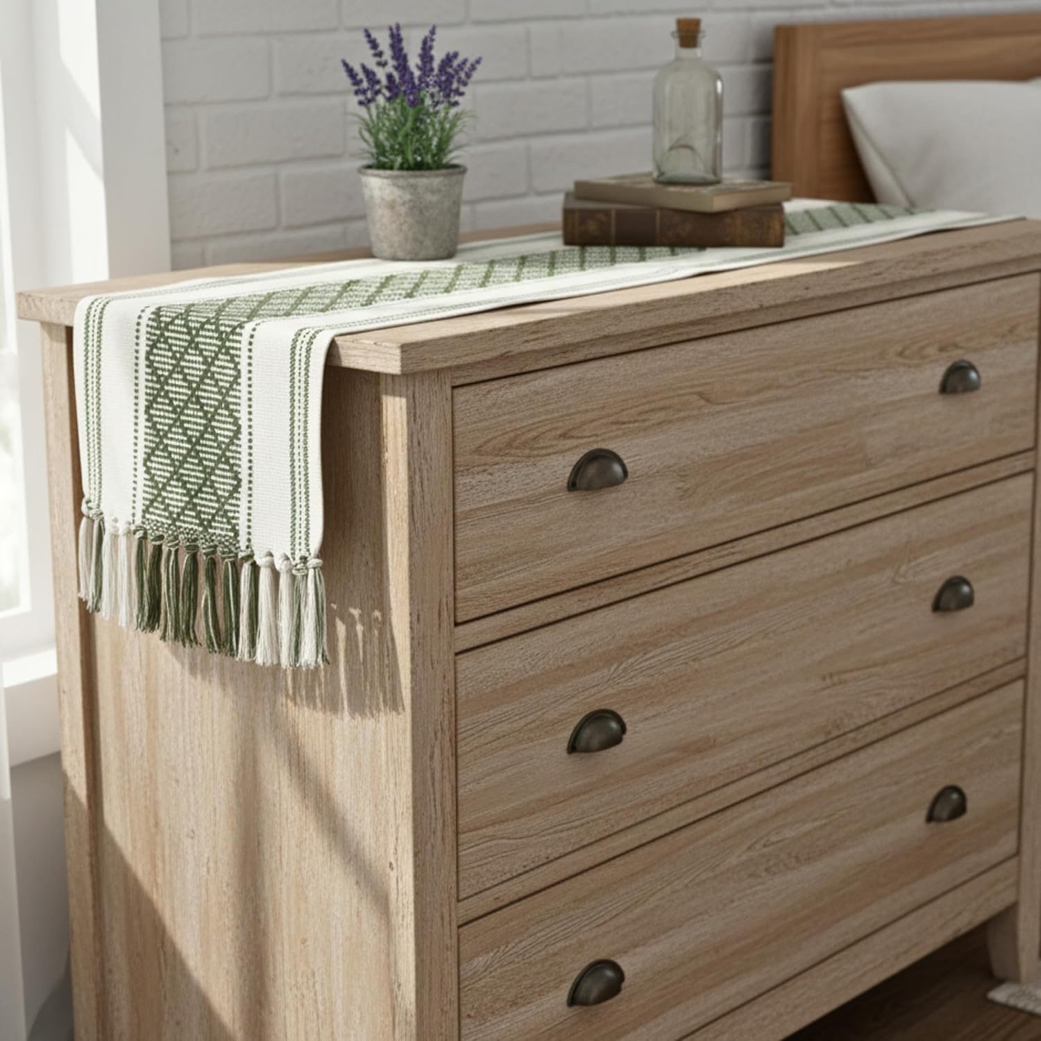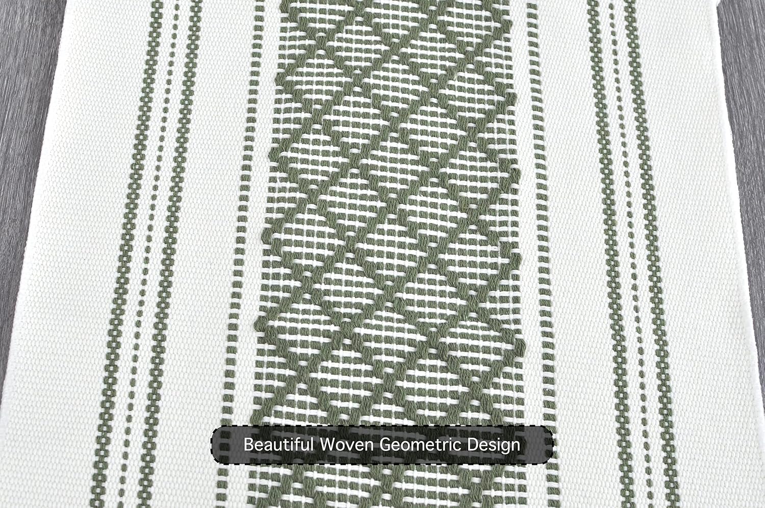Boho Dining Table Runner with Fringe 16 x72 Inches, Olive Green & Cream Checkered Pattern / Woven Washable Dresser Scarf for Bedroom, Farmhouse Console Tabletop Centerpiece Geometric Design Decor